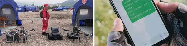 “中移果核”支撐救援現場(左),北斗短信(右)