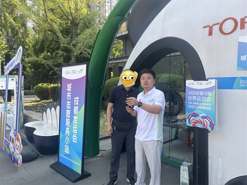 這個小站離最近的戶外比賽場地僅有500米,10點剛過,拿著賽事門票和地圖的外地游客就絡繹不絕,帶著不同口音的咨詢聲此起彼伏:“請問去桂溪公園賽場怎么走?”“世運會官方零售店在哪里?”“鐵像寺離這兒有多遠,從哪里可以過去?”隊員們一邊擦著額頭剛冒出來的汗,一邊耐心解答,遇到分不清方向的游客,還會手繪簡易路線圖,反復叮囑“直走100米看到橋右轉,這邊路陰涼多一些,您可以走這邊”。下午13點到15點是一天里最熱的時候,四十多度的高溫化作“蒸籠”,地面溫度直逼50℃,隊員們額頭上的汗順著臉頰往下淌,白色的志愿服隱約可見一圈圈白色的鹽漬。即便如此,他們沒忘了給戶外工作者遞份清涼——看到環衛工人路過、快遞員抱著包裹小跑,都會主動招手:“快進來歇哈嘛,喝瓶藿香正氣液防中暑!”