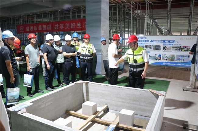 觀摩期間,與會代表深入施工現場,全面了解了項目樣板引路機制與質量管控核心流程,重點考察了項目在安全管理體系建設、人員培訓、設備管控等方面的創新實踐。在主體結構、砌體施工、風水電安裝、流態固化土處理、預制板磚胎膜工藝等多個展示區,項目講解員通過系統講解與實例展示,清晰呈現了施工現場質量管理全流程與關鍵控制點。安全體驗區與特種設備管理區通過實景演示與資料展示,全方位展現了項目“安全與質量并重”的管理理念。