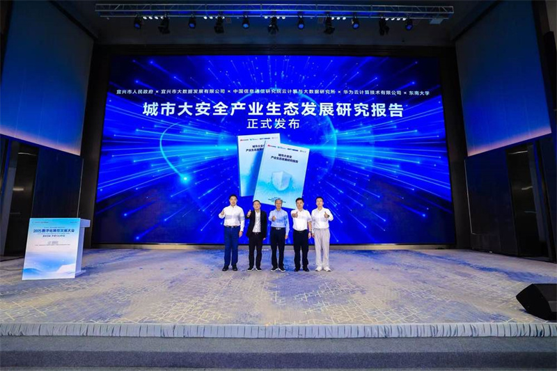 大會期間,多項政企數智化轉型領域研究成果重磅發布。其中,宜興市數據局、宜興市大數據發展有限公司、中國信息通信研究院云計算與大數據研究所、東南大學和華為云聯合發布《城市大安全產業生態發展研究報告》(以下簡稱“研究報告”),沉淀城市安全建設過程中的方法論和實踐經驗,為城市穩健發展提供了可借鑒的參考路徑。宜興市數據局局長吳南強、宜興市大數據發展有限公司董事長沈建民、信通院云大所所長何寶宏、華為云政務研究院院長劉挺、東南大學土木工程學院副院長蔣瑋共同出席發布儀式。