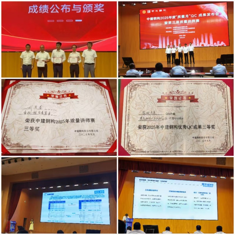以賽促學、以賽提能,是本次質量月的鮮明特色。9月5日,公司先行開展內部QC成果發布與質量講師賽選拔,優中選優推送參賽——最終,劉奕春在中建鋼構2025年質量講師賽中斬獲三等獎,李志軍在“質量月”QC成果發布中再添三等獎,胡艷、王大元等青年員工同步成長,為專業團隊注入新活力。