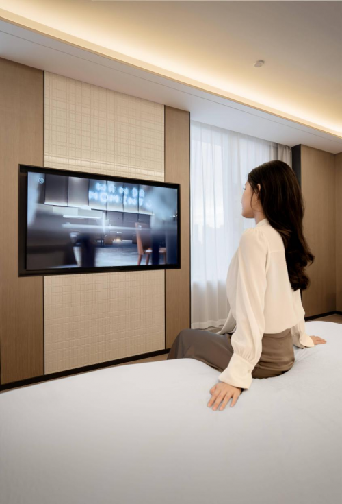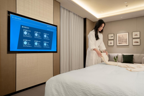 此外,想沉浸式觀影,向電視提出需求后,AI會調暗燈光、拉上窗簾、優化音響音效;準備休息時,說一句“開啟睡眠模式”,AI便會關閉電視屏幕、調暗燈光,按室外溫度和睡眠習慣把空調設到適宜區間,助住客快速入眠。