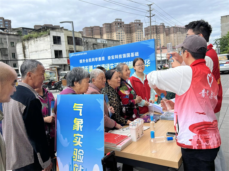 “大家知道廢舊電池屬于什么垃圾嗎?正確分類的居民可以獲得小禮品哦!”在綠色分類站,志愿者通過“拉綠分類展板宣傳”“垃圾分類知識問答”“垃圾投放模擬游戲”等趣味互動環節,讓居民在輕松氛圍中掌握垃圾分類知識。在氣象實驗站與防災科普站,來自成都信息工程大學柳寶氣象云團隊的志愿者通過識別氣象、說說雷電、氣候與水等防災減災知識手冊,并讓居民現場進行了“水龍卷”實驗,深入了解流體力學與大氣渦旋原理,向居民普及氣象常識和防災減災技能,讓居民了解地震、火災、洪水等災害發生時的正確逃生技巧。