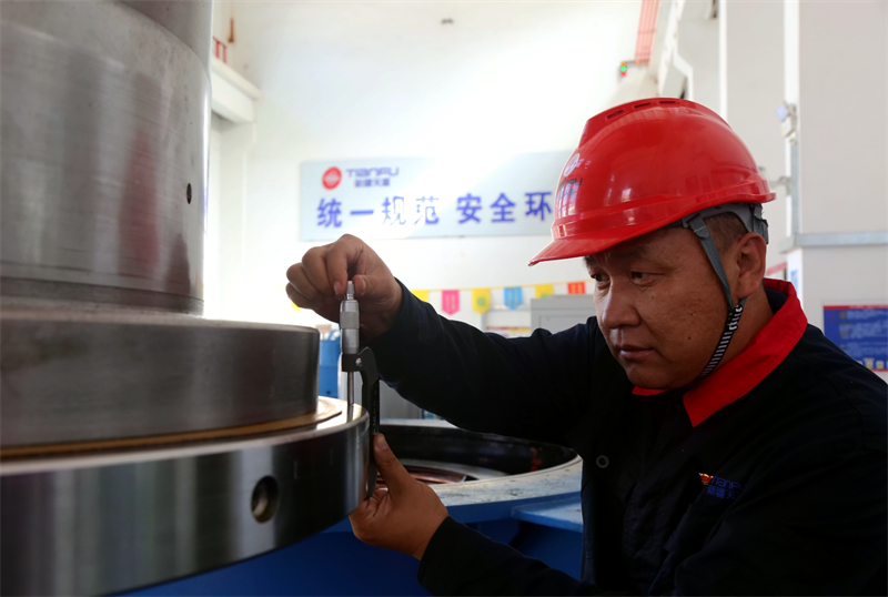 齊文凱在檢修現場檢查水輪機部件精密度。