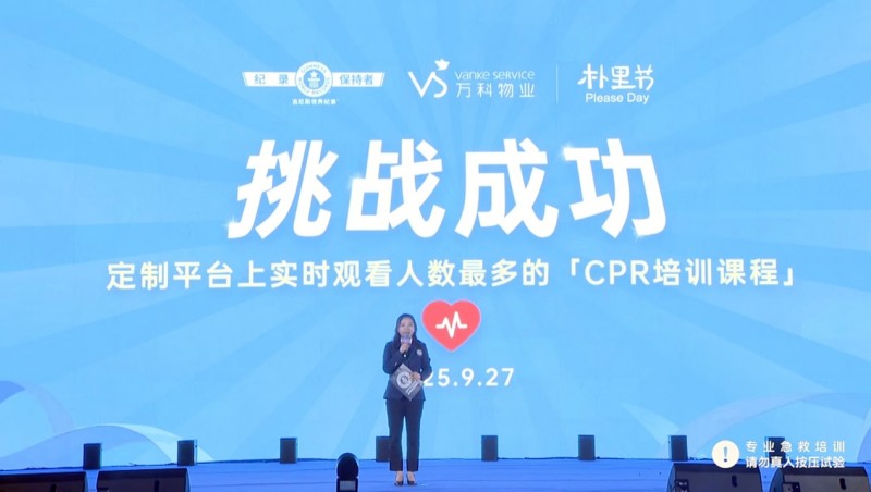 作為本屆樸里節最引人注目的環節,當晚18:55,一場“定制平臺上實時觀看人數最多的CPR培訓課程”吉尼斯世界紀錄挑戰,在線上線下同步展開。通過萬科物業“鄰居好服務”視頻號直播間在線學習心肺復蘇(CPR)急救知識,直播間實時觀看人數最高達20917人,直播總觀看人數超過10萬人次,在專業導師指導下學習心肺復蘇急救知識并成功創下紀錄。這不僅是一次技能的普及,更是萬科物業踐行ESG理念、構建社區應急保障體系的關鍵一步,彰顯了企業對業主生命健康的高度責任感。