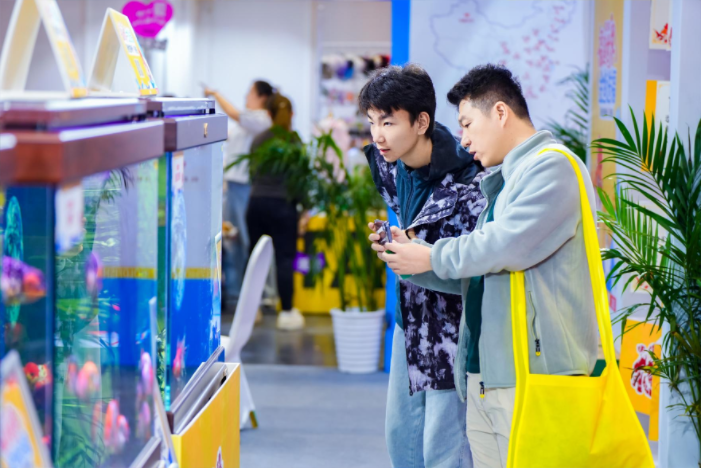 展區內的展板上,一組數據格外醒目,直觀展現著福州金魚產業的強勁實力:“全國五大第一”“100+家金魚養殖場”“2500+畝養殖面積”“100+個特色金魚品種”,讓每一位參觀者都深刻感受到福州金魚產業的深厚底蘊與蓬勃活力。值得一提的是,本次參展還帶來了金魚茶寵、IP文創周邊等跨界產品,這些融合金魚文化的衍生品,成為寵物經濟與文化消費碰撞的鮮活案例。近年來福州高度重視創作金魚衍生產品,將金魚同脫胎漆器、根雕、壽山石雕相結合,創作了眾多金魚衍生產品,讓傳統工藝與現代文創完美融合,展示福州金魚文創產業發展狀況,生動講述福州金魚文化故事。