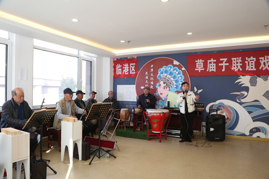 社區養老同樣是臨港區多元養老模式中的重要一環。走進草廟子鎮林泉社區黨群服務中心,20余位老人圍坐一堂,鑼鼓、二胡等樂器奏響悠揚伴奏,臺上話筒在手中依次傳遞,《紅燈記》《武家坡》等經典戲曲選段輪番上演,每曲終了總能贏得滿堂熱烈的掌聲。
