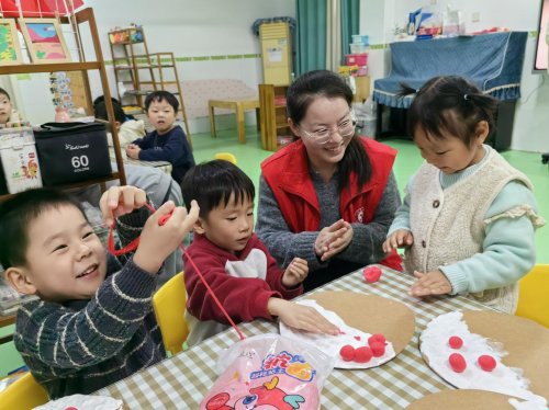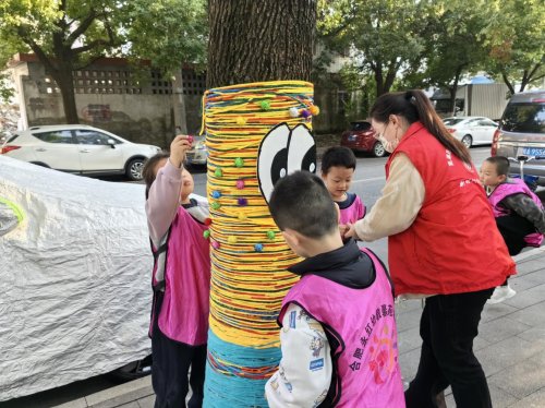 孩子們首先聚集在戶外小花園,開展了一場別開生面的“為大樹穿新衣”創意活動。在工作人員和志愿者的指導下,孩子們興致勃勃地挑選彩色毛線,小心翼翼地纏繞在樹干上。他們還將五彩毛球精心點綴其間,更發揮奇思妙想,為大樹貼上靈動雙眼。頃刻間,園中樹木仿佛被施了魔法——有的像披著彩衣的雪人,有的如扎著辮子的小姑娘,還有的儼然成了守護家園的衛士。這個環節不僅讓孩子們體驗到裝扮自然的樂趣,更在潛移默化中培養了保護環境、熱愛自然的意識。