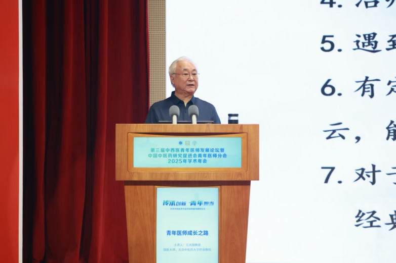 國醫大師、北京中醫藥大學終身教授王慶國以《青年醫師成長之路》為題作特邀報告,結合數十年臨床與教學經驗,從“治學態度、職業擔當、傳承創新”三方面為青年醫師答疑解惑,強調“中醫傳承需沉下心讀經典、做臨床,西醫學習要注重循證思維,中西醫融合方能突破臨床難點”。