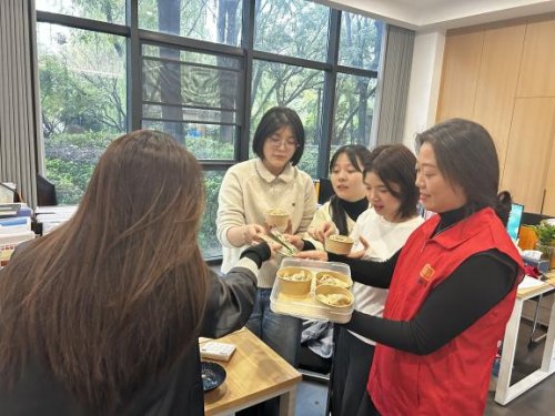 餃子包好后,黨群服務中心的工作人員與部分志愿者一同化身“暖心使者”,把“立冬關懷”送到一線職工手中。工作人員與志愿者們腳步輕快,穿梭在夢棲小鎮的產業園區里,每到一家企業門口,熟悉的招呼聲便瞬間打破工作的沉靜?!傲⒍鞓?!剛煮好的餃子,快趁熱嘗嘗!”當保溫箱被打開,鮮香的氣息瞬間彌漫開來,辦公桌前停下的職工們紛紛圍攏過來,接過裝著餃子的餐盒時,臉上的疲憊都被驚喜取代。