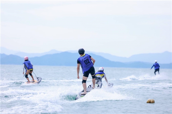 隨著開賽指令下達,動力沖浪板如“海上飛魚”劃破海面,選手們身姿矯健,在浪濤間靈活完成加速沖刺、巧妙轉彎等動作,精湛技藝引得岸邊觀眾陣陣喝彩。經過多輪激烈角逐,梁梓謙、張開竣、吳文濤分別斬獲大賽冠、亞、季軍。