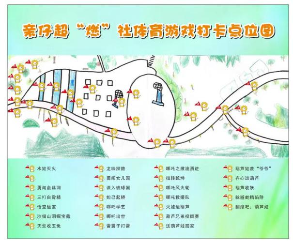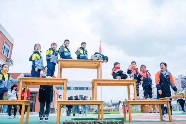 “菜單式親子體育課”創意十足,教師利用日常材料設計“實力大闖關”等活動,增進親子信任,培養幼兒勇氣;“戶外自主體鍛”“運動大闖關”“野戰探險區”等活動,讓幼兒自主決定運動方式,享受運動樂趣。同時,園所聯合家庭、社區,篩選周邊資源,完善課程資源墻,打造三位一體運動環境。