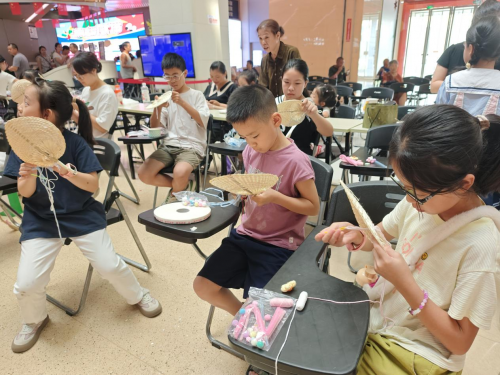 拍賣環節結束,家長與孩子共同投入蒲扇DIY環節,為炎炎夏日消除一份熱量。孩子們發揮天馬行空的想象力,家長們則提供巧手支持,一筆一畫、一粘一貼間,獨一無二的創意蒲扇誕生。發揮了孩子的動手能力與藝術創造力,更在親密協作中加深了親子情感紐帶。同時為了慶祝世運會的成功舉辦,現場設置了“合力疊塔”的互動環節,將世運會中強調的“團結與堅持”理念、競技元素轉化為適合兒童的趣味挑戰。兩個小組通過拉緊繩子控制掛鉤,協作將積木一塊塊吊起并平穩疊放,最終搭建出完整的“塔”?!隘B塔”不僅能鍛煉手眼協調和耐心,更讓孩子們體會到合作共贏的意義。