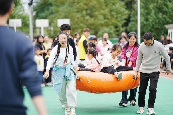 在“薪火相傳”中,家長與孩子共同抱著充氣火炬沖刺往返,傳遞著健康活力與拼搏精神;“‘足’夠精彩”環節里,親子組隊推充氣足球、合力射門,在奔跑中培養團隊意識;“迎‘籃’而上”“‘乒’盡全力”“‘馬’到成功”等項目則各有亮點,充氣籃球、充氣球拍、充氣小馬等道具讓孩子們興致勃勃,家長們也全力配合,現場歡呼聲、笑聲此起彼伏。大家在游戲中相互配合、彼此鼓勵,不僅鍛煉了身體,更增進了親子間的默契與情感。