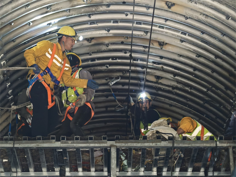 真正的攻堅開始了。定滑輪組被迅速安裝到位。一塊重達200公斤的弧形波紋鋼板被吊車緩緩吊起,懸在拱頂下方?!胺€??!慢一點…好!聽我口令,向前微調…5毫米!停!保持??!”楊英華仰著頭,緊盯著鋼板與拱頂的間隙,用手勢和短促的口令精細指揮著吊裝。鋼板精準就位,下方的工人立刻用液壓千斤頂進行臨時支撐?!般@孔組,上!”一聲令下,幾名工人仰頭弓腰,在狹小的空間里開始對位鉆孔,安裝錨桿?!奥菟ńM,緊固!扭矩扳手準備!”隨著錨桿固定,螺栓被迅速擰緊,巨大的波紋鋼板被牢牢“鎖”在了原有襯砌上。