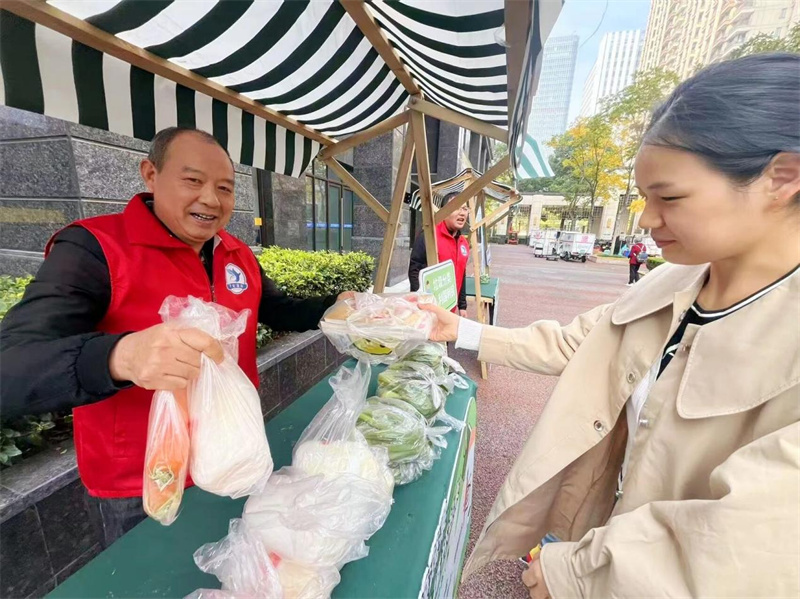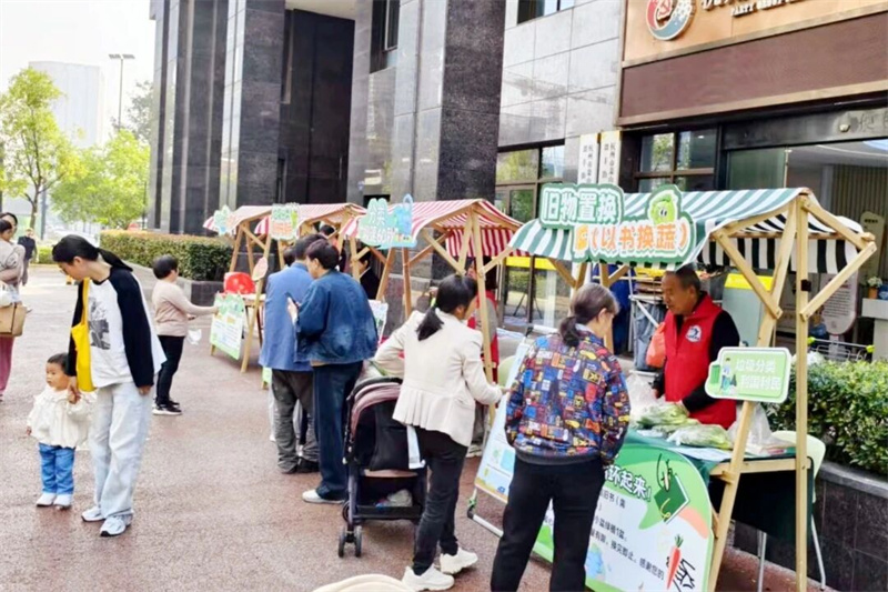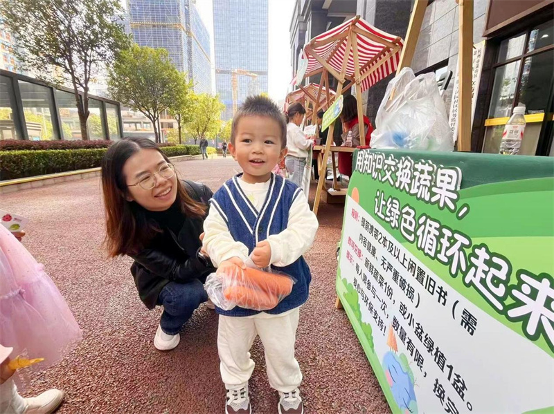 “兩本舊書換一份新鮮蔬菜”,活動現場書蔬交換如火如荼。居民們帶來閑置繪本、名著,換取菠菜、胡蘿卜、幼苗等。小朋友抱著換來的胡蘿卜說:“舊書換新綠,大家都有收獲!”