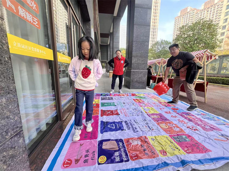 分類妙趣橫生五大主題攤位化身環保驛站,吸引眾多家庭沉浸式體驗?!袄诸惔笞鲬稹眳^域歡聲不斷,居民們在知識轉盤前踴躍答題,在巨型飛行棋棋盤上跳躍闖關,于游戲中輕松掌握分類精髓。成功挑戰的家庭,喜獲社區定制環保袋,一位媽媽稱贊:“袋子又好看又實用,真是環保又時尚!”