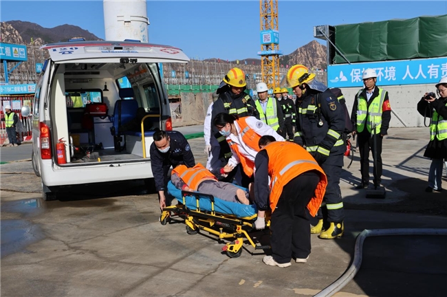 在昌平區妙峰書苑建設工程項目現場,全程模擬火災事故發生的真實場景:七號樓地下室頂板發生火災,導致一名人員被困,一名人員受傷,全員聞訊而動,嚴格按照應急預案規范有序展開救援,各小組明確分工,立即趕赴現場進行應急搶險工作。醫療救護組攜帶醫療器材趕赴現場,進行包扎傷口、骨折固定、心肺復蘇等操作,并將傷員轉運至安全地帶,保障后續救治;搶險組攜帶探桿、繩索、滅火器等救援器材,嘗試救援被困人員;昌平區消防救援支隊到達現場,在聽取總指揮對現場情況的簡要介紹后,立即協助演練活動開展現場救援指導。