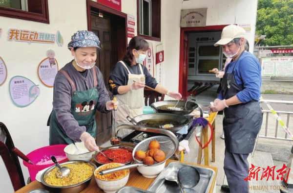 七斗沖社區長者食堂開辦后,居民積極參與食堂運營?!盁舯K窩是沅陵傳統美食,食堂頭一天晚上就開始準備,社區老人也帶著家里的廚具來幫忙,指導食堂師傅烹制?!泵缱宕蠼阆蛎氛f,這一口油炸小吃,勾起了她的童年回憶。