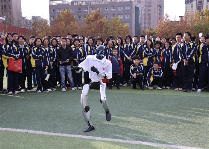 作為曾亮相春晚的“科技明星”,“宇樹機器人”的表演更是引爆全場。機器人伴隨著音樂跳起流暢舞蹈,精準靈活的動作引來陣陣歡呼;它還主動與同學們進行互動,揮手、轉圈,甚至模仿“敬禮”動作,仿佛在以科技的方式傳遞“愛國”的信號。當機器人指向校園里的國旗時,現場掌聲雷動,同學們“科技報國”的信念愈發堅定。