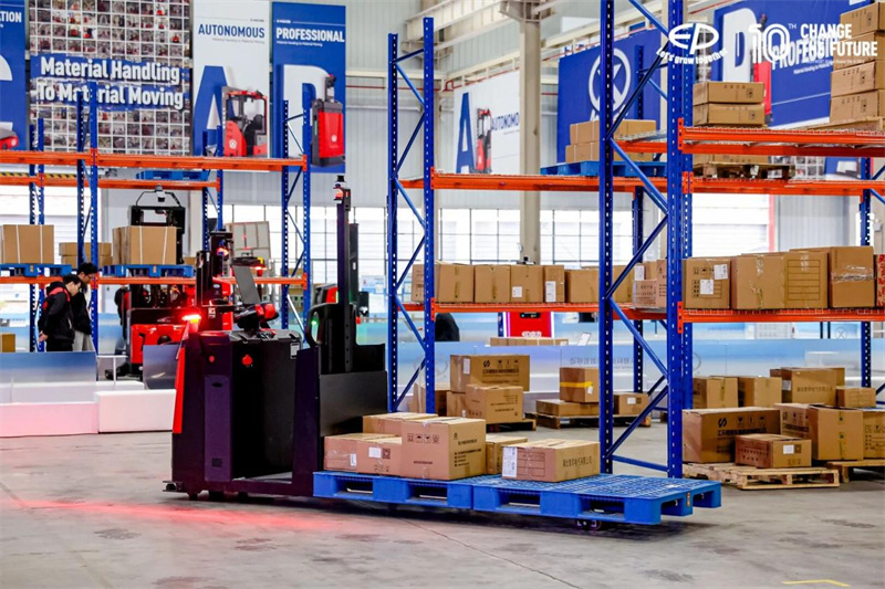 以場景痛點驅動技術創新,雙11現場,中力創新推出以低位智能跟隨揀選車+AI搬運車打通揀選至發貨區的智能搬運流程。