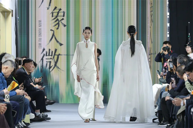 “絲路華彩·錦繡前行”絲綢創新設計專場發布秀呈現三大精彩篇章:“萬象入微”-浙理工·頔南絲韻(國際青創)2026S/S絲綢時尚發布、“頔南絲韻”優秀商戶服裝聯合發布、“2024/2025首屆中國絲綢創意設計大賽”成果發布。