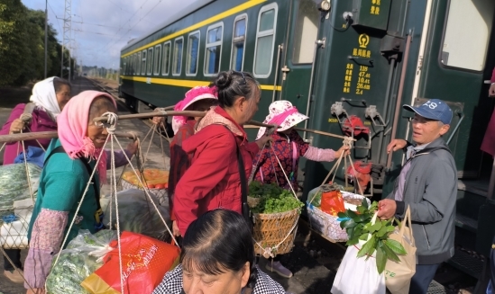 這是在昆明開往紅果的5652/1次綠皮火車上的一幕。清晨的陽光穿透云嶺山脈的薄霧,列車緩緩行駛在蜿蜒的鐵道線上?!袄相l,下站就到曲靖了,收拾好您的菜筐,慢點下車!”列車員尹師傅帶著微笑耐心的提醒準備下車的村民。