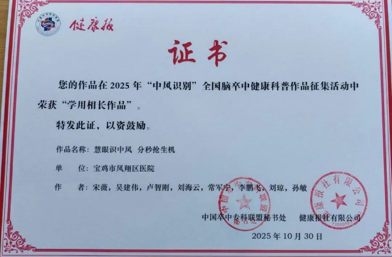 大會期間,另一則捷報傳來:在國家衛生健康委百萬減殘工程專家委員會指導,中國卒中??坡撁伺c健康報社聯合主辦的“中風識別”全國腦卒中健康科普作品征集活動中,鳳翔區醫院卒中中心參賽作品《慧眼識中風、分秒搶生機》從全國500余件作品中脫穎而出,榮獲“學用相長作品”國家級殊榮,醫院卒中中心醫療總監、神經內科主任宋薇受邀現場領獎。