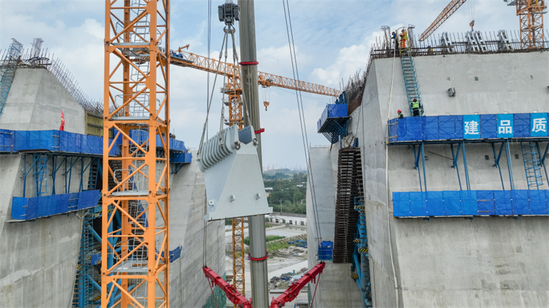 項目團隊錨定節點目標、科學組織,以“零誤差、高效率”完成系列吊裝任務。首個散索鞍在北錨碇區域成功吊裝,打響上部結構施工“第一槍”;攻克超高空安裝技術難題,主索鞍精準安全落位主塔塔頂。系列節點的穩步推進,標志著北航道橋上部結構索鞍及門架施工全面告捷,為項目后續施工按下“加速鍵”。