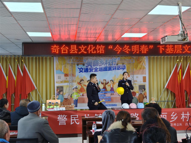 發布時間:2025-11-21 15:40:05 | 來源:中國網 | 作者: | 責任編輯:吳一凡為深入普及農村道路交通安全知識,以更接地氣、更具溫度的方式提升農民群眾的交通安全意識,11月14日,在第十四個“122全國交通安全日”來臨之際,由新疆維吾爾自治區公安廳交通管理總隊指導,昌吉州公安局交通管理支隊聯合奇臺縣公安局交通管理大隊,攜手奇臺縣文化館,走進奇臺縣五馬場鄉阿哈什胡拉克村,共同開展了一場別開生面的“美麗鄉村行”交通安全巡回宣講活動,為冬日鄉村帶來一場安全與文化的“暖心盛宴”。