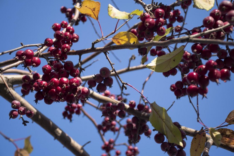 “粒粒丹珠綴滿枝,尋香蝶雀恐來遲”,步入文化南廣場,一樹樹海棠果早已褪去青澀,披上了紅色的冬裳。它們不像花兒般嬌艷,卻如一顆顆精心打磨的瑪瑙、一粒粒飽滿的丹珠,三五成簇,五六成團,沉甸甸地壓彎了枝頭,在湛藍晴空下暈染開溫暖的光澤,為冬日的單調畫卷添上一抹融融暖意。枝頭間,往來穿梭的鳥兒格外熱鬧,它們輕啜果實,在疏影間跳躍嬉戲,安然享受這一季的慷慨饋贈。