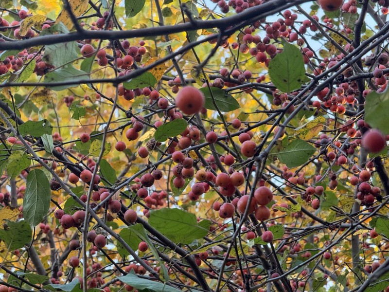 西環公園的海棠位于兒童活動場的西側,一顆顆圓潤飽滿的果實,擠擠挨挨地綴在疏枝間,陽光灑下時,泛著晶瑩的光澤,像一串串紅燈籠點亮了清冷的冬天。漫步海棠林,抬頭是紅綠交織的枝頭,低頭是偶爾滾落的熟透果實,俯身還能聞到淡淡的果香。更有意思的是,冬季的海棠果成了鳥兒的“冬季限定美食”,經常能看到鳥兒停在枝頭,啄食果子的同時,還會“嘰嘰喳喳”唱著歌,人與自然同享冬實的畫面,治愈感滿分。