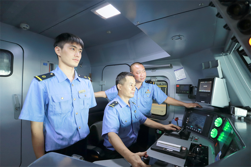 手握閘把,目視前方,55歲的張進軍端坐在司機室里全神貫注……。列車緩緩駛出站臺,他輕輕推動手柄,動作柔緩得像是怕驚醒熟睡中的嬰兒?!翱蛙嚭拓涇囃耆煌?,”他對身旁25歲的徒弟李湘龍說,“要時刻想著旅客的舒適度。就像端著一碗水,得讓水紋絲不動?!痹捯袈湎?,旅客杯中微微蕩漾的水波已恢復平靜。這是今年9月28日,韶關運用車間首趟臨客列車開行的場景。