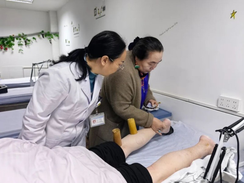 在醫院的針灸推拿康復科,張紅霞教授不僅分享了蒙醫藥在治療心腦血管疾病、消化系統疾病等方面的“三根平衡”理論與寒熱辨證,更深入病區,為腰椎病患者施治。她采用蒙醫傳統拔罐技術作用于百會穴與委中穴,配合腕踝針、頭針及手部腰痛穴的精準刺激,這一套融合了蒙醫特色與傳統中醫經絡理論的組合療法,讓在場的醫護人員眼前一亮。