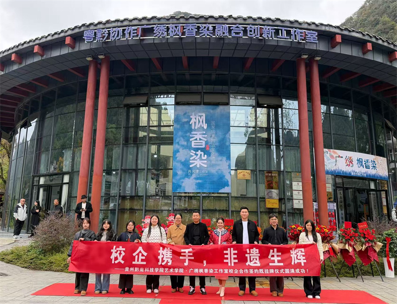 2025年10月,藝術學院與非遺傳承人、行業企業共建“粵黔協作廣繡楓香染融合創新工作室”實習實踐基地,成為傳統工藝與現代設計碰撞的試驗場。藝術學院繪畫、視覺傳達設計專業學生在這里不僅系統學習廣繡針法與楓香染技藝,更通過“非遺+文創”“非遺+產品設計”等課程模塊,探索傳統技藝的年輕化表達。