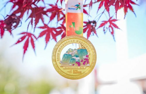 完賽獎牌延續“黃山五絕”立體組合設計,“怪石”主題獎牌正面以“飛來石”為中心,搭配杜鵑花紋樣,背面鐫刻賽事主題及卷草紋底紋,中間模塊可作冰箱貼。連續五年完賽集齊五塊獎牌可拼接成全國首個黃山五絕立體擺件。